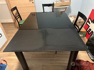 Tavolo con 4 sedie allungabile, chiuso 1mt x 1mt. Aperto 1mt x 1.5mt.sedie imbottite. Qualche segno ma nessun danno strutturale. Non spedisco.