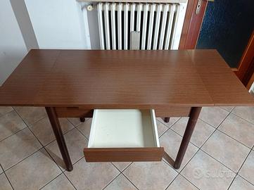 Tavolo con prolunghe per cucina o sala/salotto. Misure da chiuso: lunghezza 99cm * larghezza 64cm * altezza 79cm. Misure da aperto: lunghezza 149cm * larghezza 64cm * altezza 79 cm. Misure interno cassetto: lunghezza 33,5cm * larghezza 44cm * altezza 7cm. Materiale: legno color tabacco