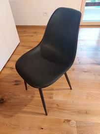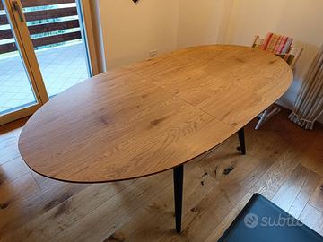 Tavolo ovale allungabile con gambe in metallo colore nero e piano in mdf finitura rovere sp. 4 cm, larghezza max. 93 cm, lunghezza 160/200 cm, con 6 sedie in polipropilene colore nero e gambe in metallo colore nero.