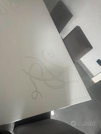Tavolo marca Stones allungabile fino a 2,40m bianco contemporaneo intagliato. Completo di 6 sedie grigio tessuto lavabile. Misura 1,90x90 allungabile fino a 2,40m.