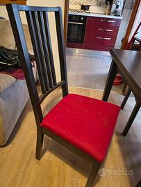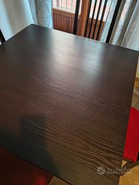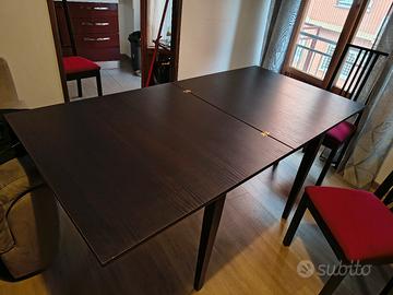 Tavolo allungabile marrone wengè con 4 sedie con imbottitura rossa. Le misure da chiuso sono cm 90x90, da aperto cm 90x180. Il tavolo presenta qualche piccolo graffio ma nel complesso è molto ben tenuto. Solo ritiro a mano zona Portuense Largo La Loggia.