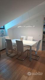 Tavolo in acciaio e cristallo bianchi (90cm x 160cm allungabile a 200cm). In perfetto stato: non ha un graffio. Facilmente amovibile grazie alle rotelle inserite nelle gambe da un lato mentre si può allungare di 40 cm dall'altro lato. Completo di dieci sedie in similpelle bianco e gambe a C in acciaio cromato. Prezzo di acquisto originale: 1800€ per il tavolo e 350€ per le 10 sedie.