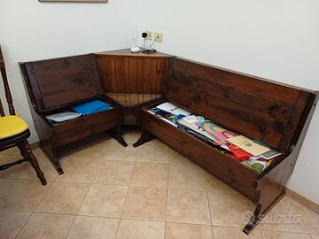 Tavolo in legno massello, due sedie e cassapanca angolare, marca Patriarca