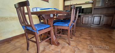 Vendo tavolo da pranzo in legno con 6 sedie coordinate, in stile classico (arte povera), solido e molto elegante. ✔ Tavolo ALLUNGABILE (perfetto sia per uso quotidiano che per ospiti) ✔ Struttura robusta e stabile ✔ 6 sedie coordinate con cuscini inclusi ✔ Ottime condizioni, sempre tenuto con cura ✔ Nessun difetto evidente Colore: legno scuro Posti: 6 (espandibile) Misure: da chiuso 180 l x 85, estensibile con 2 tavole 💰 Prezzo: 320 € leggermente trattabile 📦 Smontaggio e trasporto a carico dell’acquirente. Disponibile subito. Contattami per info o per vederlo dal vivo. 👉 Se interessati anche alla parete attrezzata abbinata visibile in foto, possiamo accordarci per un prezzo complessivo.