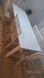 Tavolo bianco in legno 90x160 allungabile con 2 prolunghe da 40cm fino a 240cm, 6 sedie in legno bianche con cuscini in ecopelle ancora inpellicolati.