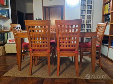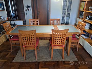 Usato ma in buone condizioni, qualche piccolo graffio rimediabile sulle zampe e quel piccolo danno nella carta sottostante il vetro evidenziato nell'ultima foto. 6 sedie massicce in ottime condizioni.