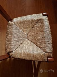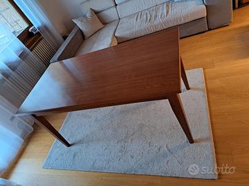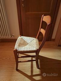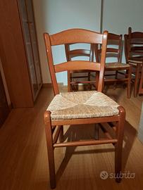 Tavolo allungabile con struttura in legno, color ciliegio, 160 cm x 80 cm chiuso, 200 cm x 80 cm aperto, 6 comode sedie in legno color ciliegio e seduta in paglia, alcuni segni sugli schienali. Il tutto usato ma tenuto bene.