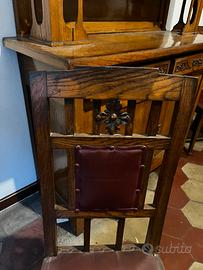 Tavolo in rovere massello allungabile cm 122 X 122/240 doppie gambe che scorrono con 6 sedie imbottite sulla seduta e sullo schienale in cuoio , tutto con decori in stile liberty, al tavolo manca l’allungo, facilmente riproducibile, disponibili anche altri arredi compatibili