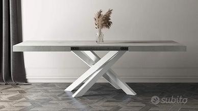 Mobili Fiver, Tavolo Allungabile Emma 140(220) x90 cm, Grigio Cemento con Gambe Incrociate Bianche, per 6-10 persone, Tavolo Cucina, Soggiorno, Made in Italy