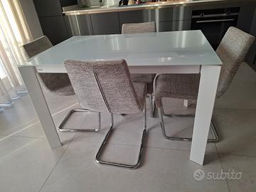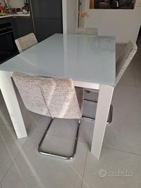 Tavolo di design marca Friulsedie modello Galileo duetto dimensione da chiuso 120x80 cm più due allunghe da cm 40 ciascuna. Aperto arriva a 200x80 cm. Il piano è in vetro temperato bianco lucido mentre la struttura in metallo è bianco opaco. Le allunghe sono nascoste nella parte inferiore e sono in legno laccato bianco opaco. Il tavolo non presenta difetti né usura ad eccezione di una piccola scheggiatura su una delle due allunghe.