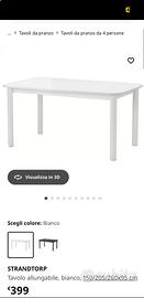 Tavolo Ikea STRANDTORP laccato bianco con gambe in metallo. Allungabile fino a 12 posti, vedere foto. Chiuso é lungo 150 cm e si apre per 3 volte fino a 206 e 260 cm. Usato come nuovo, vendo per cambio arredo e adattamento a nuovi spazi. Sedie NON incluse. NB: vi è un piccolo graffio impercettibile come in foto su di un lato del Top. Ritiro a Bari.