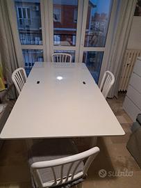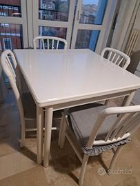 Vendo tavolo da pranzo in legno massello, solido e resistente, completo di 4 sedie coordinate. Il tavolo è allungabile, grazie al pratico sistema con apertura centrale che permette di aumentare i posti a sedere, ideale sia per l’uso quotidiano che per ospiti. Caratteristiche: Struttura robusta in vero legno massello (non truciolato) Colore bianco, facile da abbinare a qualsiasi arredamento Meccanismo di apertura semplice e funzionante 4 sedie incluse con seduta imbottita Condizioni buone, con normali segni di utilizzo È un tavolo di qualità, di quelli che oggi difficilmente si trovano, pensato per durare nel tempo. Perfetto per cucina o sala da pranzo. Ritiro a mano a carico dell’acquirente. Non effettuo spedizioni.