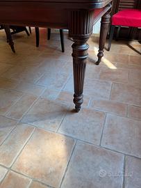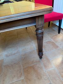 Tavolo in noce con cornice in mogano, fine ‘900, misure 156 x 105 con allunga di 50 cm, gambe intarsiate con ruote. No perditempo.