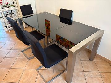 Vendo elegante tavolo allungabile con piano in vetro e struttura in acciaio, dal design moderno e raffinato, perfetto per cucina o sala da pranzo.