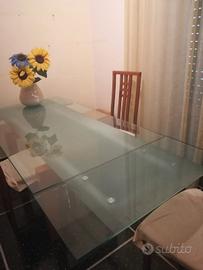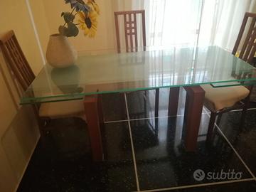 Tavolo allungabile marca Cattelan Italia, con piano in cristallo serigrafato lateralmente , allungabile da 6 a 8 posti. Dimensioni , 160 cm x90 cm X 75cm di h. Allungato misura 230 cm. Le basi sono in legno di ciliegio, lo scorrimento avviene su binario. I binari sono in alluminio sabbiato. In perfetto stato di conservazione. Linea moderna che si adatta ad ogni arredamento.