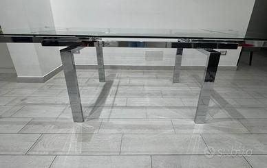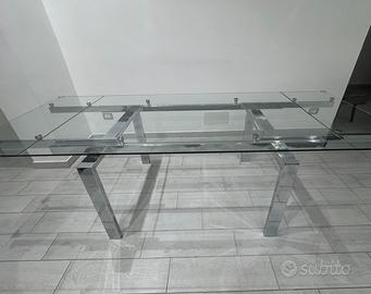 Tavolo in vetro allungabile con struttura moderna in metallo cromata.