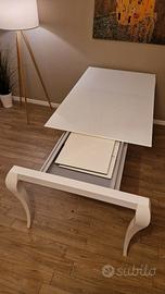 Ripiano in vetro bianco, gambe in legno laccato bianco, prolunghe in melaminico bianco.