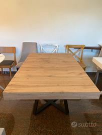 Tavolo nuovo quadrato con misure cm 90x90 allungabile a cm 145x90, piano in legno laminato tinta rovere naturale con basamento in metallo.