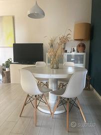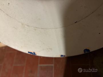 Tavolo rotondo in legno di cm 124 e allungabile a cm 167 , con piede centrale. Dipinto di bianco anni fa ma necessita di essere ridipinto. In galleria le foto dei difetti di colore.