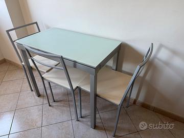 Tavolo da cucina allungabile. Misure indicate in foto. 90 x 50 (chiuso) oppure 90 x 90(aperto). Altezza cm 74. Pagato 500 euro, vendo ad euro 230. Comodissimo anche come base di appoggio in cucina. Articolo bello e solido (acquistato presso mobilificio). Gradita la consegna a mano in Molise o nel Lazio (entra tranquillamente in macchina). Volendo aggiungo n. 3 sedie visibili in foto al costo di euro 15 cadauna. Massima serietà.