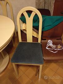 Vendo tavolo rotondo allungabile color panna con 6 sedie. La seduta è color azzurro scuro Il prezzo basso è perché abbiamo urgenza di venderlo a causa della casa in vendita