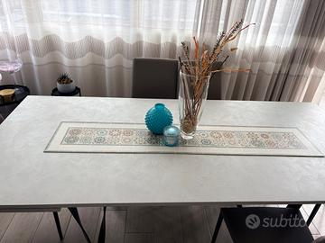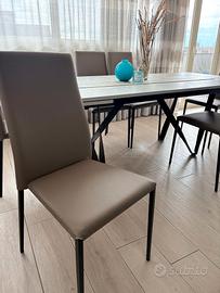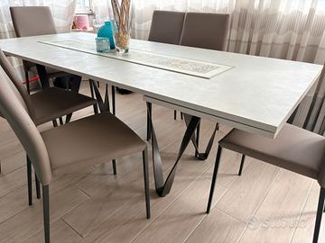tavolo allungabile modello Sedit Wave con top bianco effetto pietra e gambe incrociate metallo nero. stile moderno. come nuovo. ottima qualità e resistenza. 6 sedie in ecopelle colore fango e piede nero. buone condizioni ma con piccoli segni di usura. lunghezza 220/270/320cm x larghezza 100cm