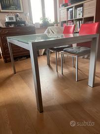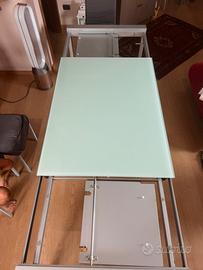 Il tavolo in vetro temperato con struttura in alluminio. Chiuso misura 180x90 cm, può essere allungato fino a cm 240 inserendo le due prolunghe. Il tavolo può essere facilmente spostato con l’ausilio di due rotelline posizionate sotte le gambe . Il vetro risulta nuovo senza graffi perché sempre utilizzato con la tovaglia.
