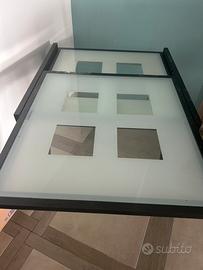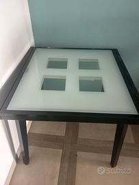 Tavolo con struttura in legno e piano di vetro resistente. Quadrato e allungabile