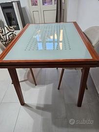 Il tavolo è in legno massello color ciliegio col piano in vetro. Il tavolo chiuso misura: lunghezza cm.120 largo cm.90 ed alto cm 76. Il tavolo allungato misura cm. 240. Il tavolo è in ottime condizioni.