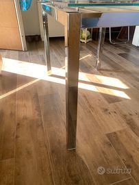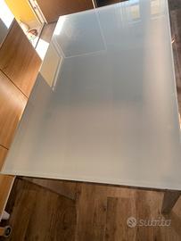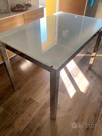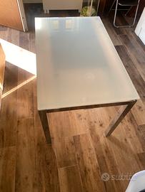 Vendo tavolo allungabile gambe in acciaio, piano in vetro bianco, prolunga in legno bianco Misure: altezza cm 77 Larghezza cm 70 Lunghezza cm 110/150