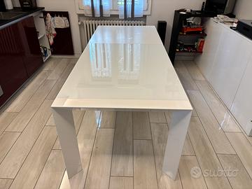 Tavolo moderno allungabile bianco lucido con piano in vetro.