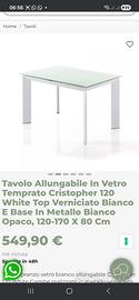 Vendo tavolo bianco allungabile in vetro Christopher come da foto. Condizioni molto buone, nessun segno evidente di usura o ammaccature. Dimensioni da chiuso 140 x 90 cm; da aperto 210 x 90 cm. (L’immagine tra le foto é solo per mostrare il modello, le misure sono diverse).