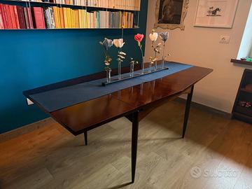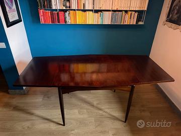Tavolo allungabile Vintage Mid-Century dal design scandinavo in legno di palissandro scuro, lucido, con particolare piano di forma esagonale, dalla linea sobria ed elegante.