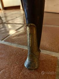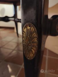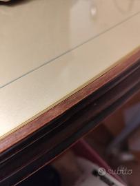Bellissimo tavolo anni '50 e n.6 sedie. Il tavolo è in legno scuro e ripiano in vetro verde. Dimensione 190x90cm circa. Le sedie (nella foto presenti solo 4 delle 6) in legno verde e seduta in velluto rosso.