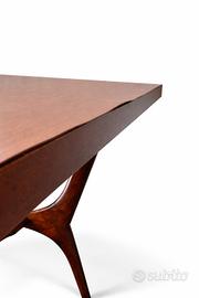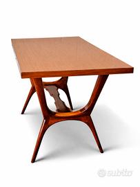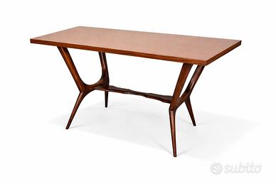 Bellissimo tavolo, anni 50, base in legno con linee curvate, piano in legno con parte superiore in formica; buone condizioni, struttura sana e priva di tarlatura, si segnalano difetti sul bordo del piano, visibili in foto. Altezza. 80 cm. Larghezza. 148,5 cm. Profondità. 75,5 cm.