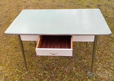 Tavolo anni 60 con gambi in ferro cromato e piano in formica color verde con cassetto. Misure: cm.125 x 75 x h. 80 Condizioni: molto buone, con inevitabili segni del tempo, un po’ di ruggine superficiale nei gambi cromati, vedi foto.