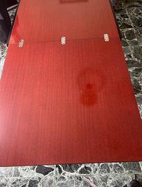 Tavolo da pranzo estensibile rosso ciliegia – Anni ’80/’90 – 6/8 posti In vendita questo bel tavolo da pranzo rettangolare estensibile. Caratteristiche: • Piano in laminato lucido rosso ciliegia/mogano con bella venatura (molto resistente e brillante) • Struttura e gambe in metallo nero opaco, sobrio e moderno • Estensibile con due prolunghine centrali (cerniere visibili nella foto) • Chiuso: circa 120-130 cm di lunghezza (da confermare sul posto) • Aperto: arriva facilmente a 160-180 cm → perfetto per 6-8 persone • Altezza standard da pranzo (circa 75 cm) Condizioni: usato ma in buono stato generale. Il piano ha qualche piccolo segno d’uso e graffietto leggero (normale per l’età), ma resta lucido e pulito. Struttura solida, nessuna ruggine visibile. Ideale per sala da pranzo, cucina abitabile o open space. Il colore rosso dà carattere e calore all’ambiente! Prezzo: 160 € (negoziabile) Venduto così come in foto. Spedizione non consigliata (troppo ingombrante e pesante) → meglio ritiro a mano (specifica la tua zona).