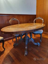 Tavolo antico '800 inglese piano ovale intarsiato con il piano di appoggio di lunghezza 140 cm. e di larghezza 100 cm + 4 sedie foderate e imbottite nella seduta