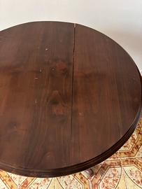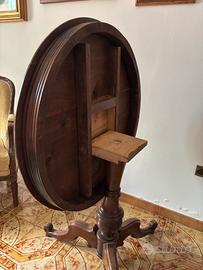Vero pezzo d'antiquariato in legno massello, caratterizzato dal classico piano circolare ribaltabile "a vela" e solida base a tripode tornita. Elegante e funzionale, ideale per ottimizzare lo spazio.