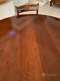Vendo elegante tavolo antico apribile rotondo in legno scuro con intagli decorativi, completo di 4 sedie coordinate. Le sedie presentano una raffinata decorazione intarsiata nello schienale e seduta imbottita in tessuto chiaro.