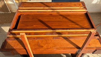 1,15 x 96 ma estendibile attraverso le tavole riposte all’illinterno. Contiene inoltre delle sezioni interne segrete coperte (vedi foto). Il tavolo è in ottime condizioni ma necessita di un trattamento di restauro per i fori delle termiti.