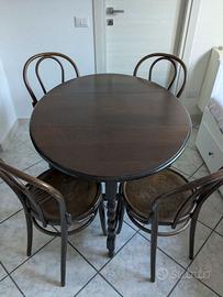 Vendo tavolo antico pieghevole e quattro sedie rustiche in buono stato, come da foto. Mostrano imperfezioni e leggeri graffi che con un trattamento di lucidatura dovrebbero sparire. Si possono chiedere ulteriori fotografie. Alcune parti sono consumate dal tempo. Di seguito le misure: Tavolo: Larghezza al centro, circa 93 cm Lunghezza per esteso, circa 120 cm Lunghezza con solo lato aperto, circa 83 cm Lunghezza chiuso, circa 45 cm Altezza, circa 74 cm Sedie: Altezza da schienale, circa 88 cm Altezza da seduta, circa 46 cm Larghezza, circa 44 cm Lunghezza da schienale, circa 53 cm
