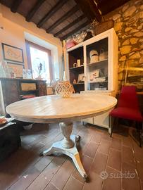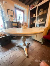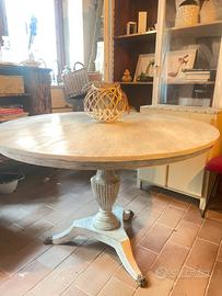 Tavolo tondo a vela cin decapatura bianco latte e patina. Dianetro 118 cm
