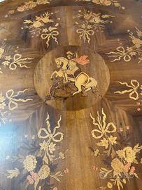 Antico tavolo intarsiato in acero ed in noce nazionale, di fine anni '50/inizio anni '60, appena completamente restaurato, con decorazioni e figura centrale di San Giorgio che uccide il drago, con lastra di vetro di circa 1 centimetro di spessore che riveste interamente la superficie del tavolo.