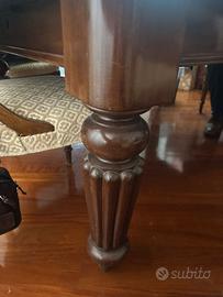 Bellissimo tavolo in piuma di mogano, allungabile con meccanismo a manovella, completo di sei sedie. Sia il tavolo che le sedie sono dotati di rotelle. Il tavolo misura 150x135 cm. ed è dotato di una prolunga centrale. Molto scenografico e in ottimo stato. Un vero affare!