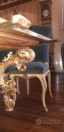 Prezioso grande tavolo rettangolare italiano realizzato nella prima metà del 1800 da alta falegnameria napoletana completo di 18 sedie. Dimensioni 131 x 282 cm con due allunghe una di 90 cm e una di 58 cm che determinano una lunghezza totale di 430 cm. Le gambe del tavolo si collegano tra loro costituendo una bellissima e complessa opera artigianale lignea rifinita con doratura foglia oro, il piano in legno è dipinto con effetto marmo verde alpi (presenta alcune lacune). Le sedie imbottite coeve del tavolo, con cinghie e molle, sono state ri-tappezzate con velluto da bravissimo artigiano romano negli anni 90. Possibilità di acquisto separato di servante coordinata 330x57xh100 cm.