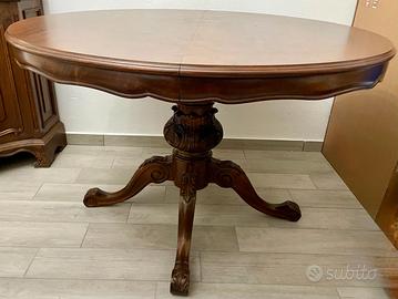 Tavolo da pranzo/sala rotondo allungabile con base centrale da 4 o 6 posti, base a colonna in legno intagliato in legno di noce di massello in stile antico.