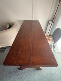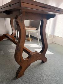 Vendo tavolo in legno dallo stile classico, con piano rettangolare e struttura solida. Le gambe laterali sagomate gli conferiscono un carattere elegante e particolare, adatto sia come tavolo da pranzo, scrittoio ampio, tavolo da lavoro o complemento d’arredo per studio/sala. Il tavolo è stabile e funzionale. Presenta alcuni segni del tempo e graffi superficiali sul piano, visibili in foto, che non ne compromettono l’utilizzo e possono eventualmente essere sistemati con una lucidatura o piccolo restauro. Ideale per chi cerca un mobile in legno dal gusto tradizionale, robusto e versatile. Condizioni: buone, con normali segni d’uso Ritiro: a carico dell’acquirente