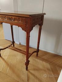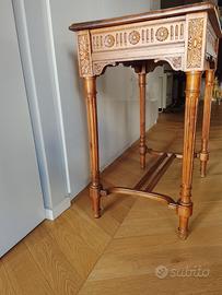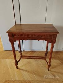 Tavolo ottime condizioni noce nazionale ,legno massello, intarsiato misure 45,5 cm x 69 cm , h 76,5 cm completamente restaurato. Intarsiato finemente a mano con gambe tornite e intarsiate a colonna.