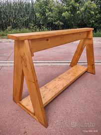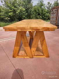 Se vi piace ed interessa provate a contattarmi, troveremo anche un accordo sul pezzo. Si tratta di un tavolo realizzato con due assi in legno massello di abete e due cavalletti sempre in legno massello di abete. Le tavole del piano hanno spessore di mm28, per le altre lo spessore è di mm25. Le tavole non hanno parti scollate, zone con crepe o tarli. I legni sono sani ed è tutto ben consolidato. Le superfici verniciate hanno piccoli difetti dovuti al tempo e all'utilizzo. Il tavolo si può usare con le assi messe una sopra l'altra, oppure allargato con le due tavole accostate ed allineate con un incastro. Posso consegnare. Dimensioni del tavolo chiuso: cm 200, cm72. Altezza 80. Tavolo aperto: cm200, cm140. Altezza cm77.